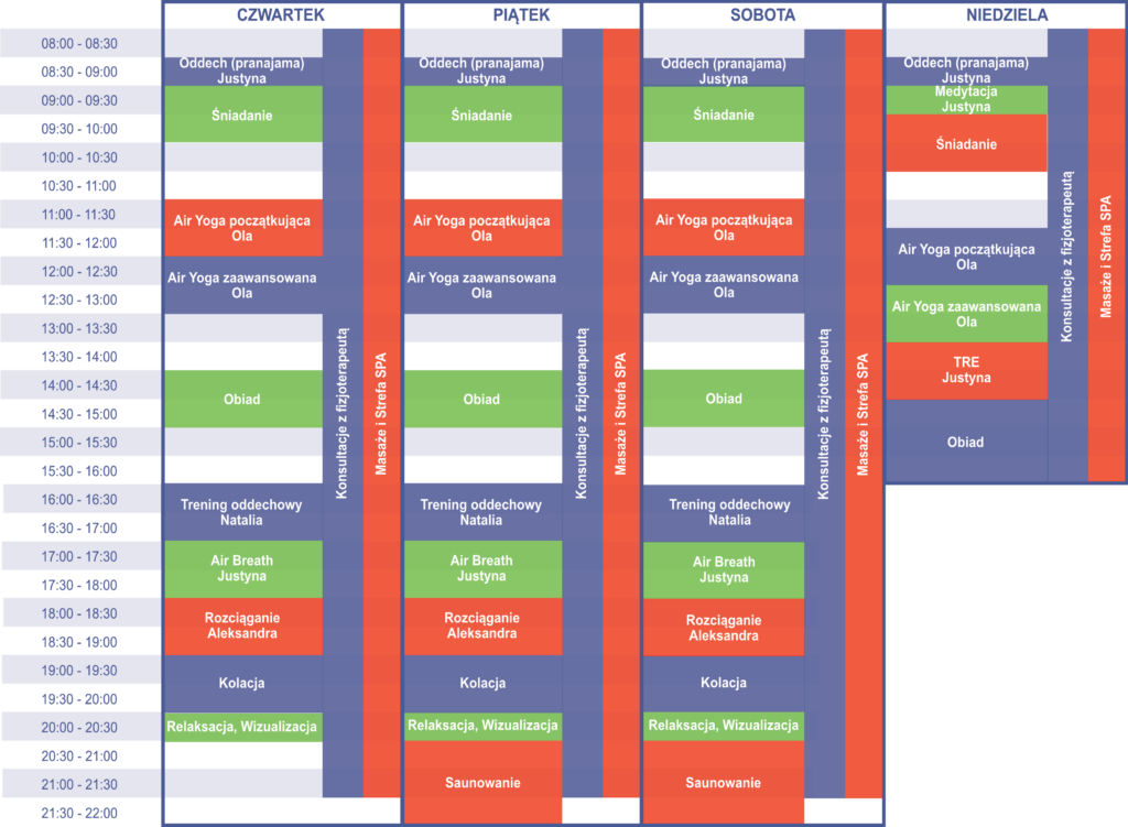 Plan dnia jest zbudowany w taki sposób abyś mógł swobodnie dobierać sobie aktywności i spędzać czas wedle Twojego uznania.